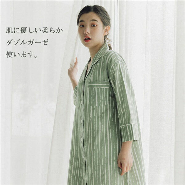 コットン ネグリジェ 前開き パジャマ ワンピース ダブルガーゼワンピース パジャマ シャツワンピース ストライプ柄 レディース 前開き 授乳 入院時 プレゼント マタニティ ゆとり 母 女性 寝間着 パジャマ 部屋着 ガーゼ 五分袖