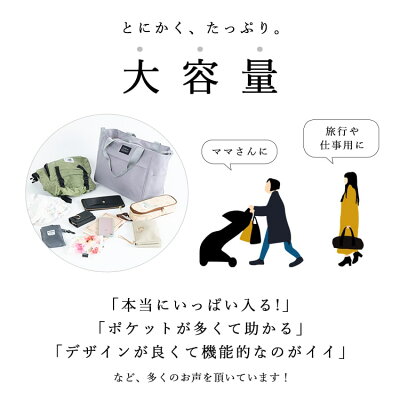 ・大容量…マザーズバッグや旅行、ジム用など幅広く使える容量たっぷりのボディ ・10ポケット…様々な種類のポケットが計10か所もあり、整理しやすくとっても便利! ・2way…トートからショルダーに出来る2wayタイプでシーンに合わせて使えます A4サイズ収納可能、ペットボトルホルダー、仕切りなど便利な仕様が盛りだくさん♪